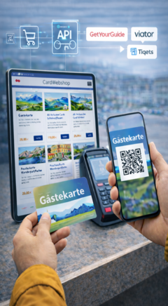 Card & Experience Sales forms the platform's central sales system and supports both digital sales channels (web shop, PWA/app, API integration) and stationary point-of-sale processes in tourist information centers, host establishments, and other points of sale.